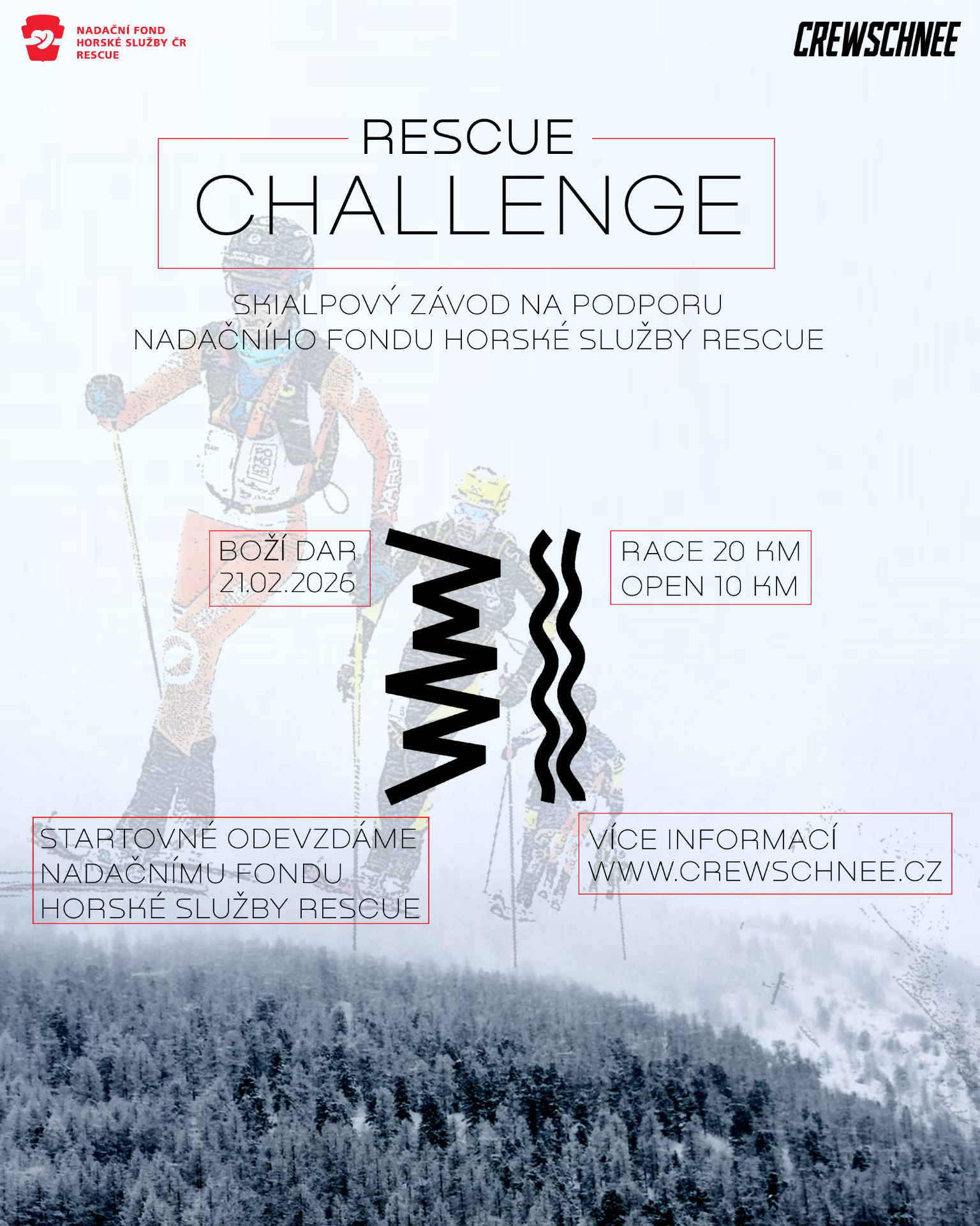 LETOŠNÍ ZÁVOD BUDE OPĚT NA DVOU TRATÍCH. OPEN 10, ZÁVOD JEDNOTLIVCŮ NA TRATI KOLEM 10 KM URČENOU PRO ZAČÍNAJÍCÍ SKIALPINISTY A HLAVNÍ TRAŤ INDIVIDUÁLNÍHO ZÁVODU RACE 20, KTERÁ BUDE URČENA POKROČILEJŠÍM ZÁVODNÍKŮM. NA HLAVNÍ TRATI ZÁVODU CREWSCHNEE RESCUE CHALLENGE - RACE 20, SE POJEDE O 30 000 PRIZE MONEY. TYTO PENZE SI ROZDĚLÍ ABSOLUTNÍ VÍTĚZOVÉ SVÝCH VĚKOVÝCH KATEGORIÍ.